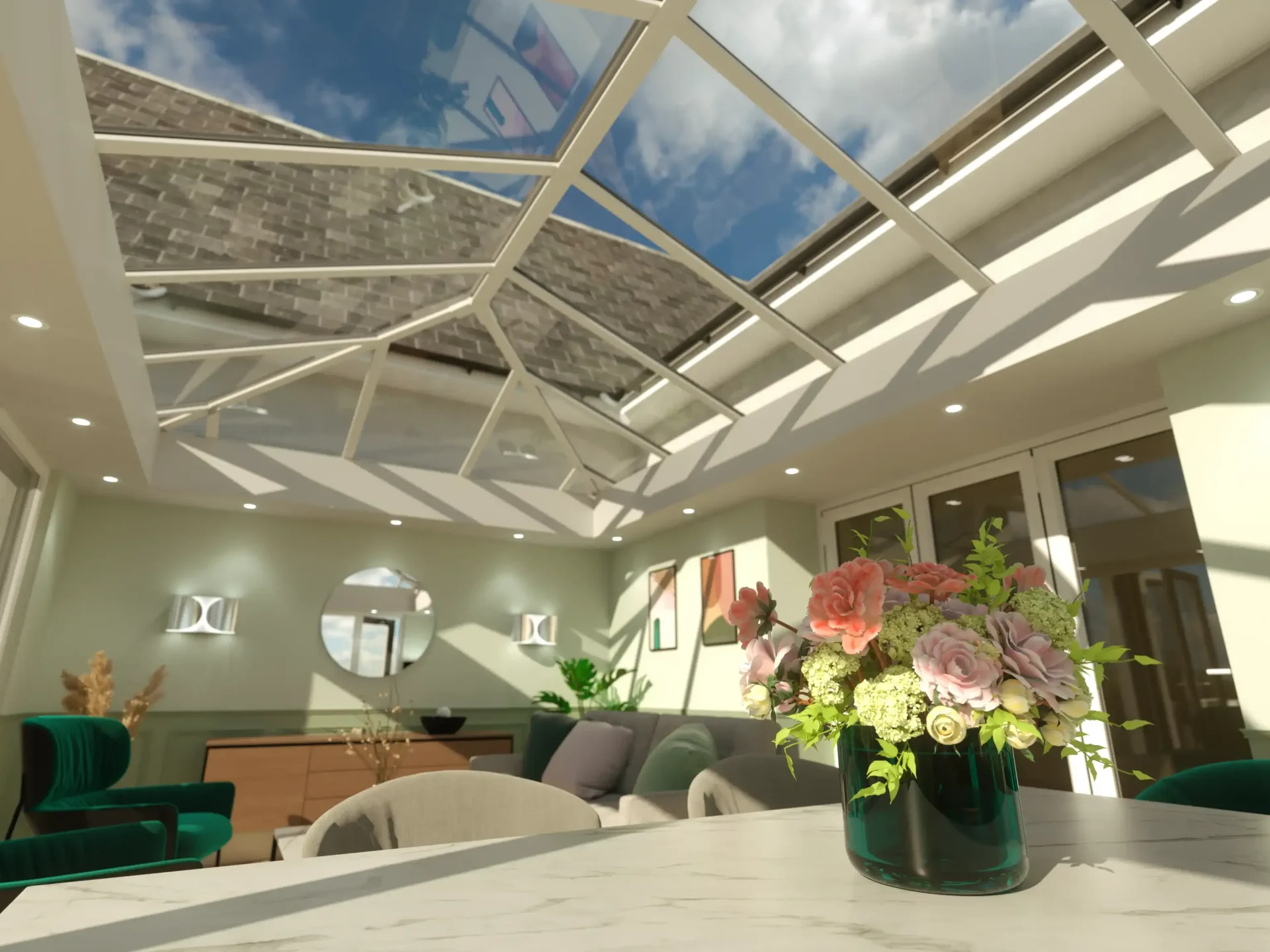 A glass roof is a type of conservatory or extension roof made with high-performance glazed panels instead of traditional solid materials. It’s designed to let in natural light while offering excellent thermal insulation, creating a bright, open space you can enjoy all year round. Modern glass roofs are also built to reduce glare, noise, and heat build-up, ensuring they are a stylish, practical upgrade.
