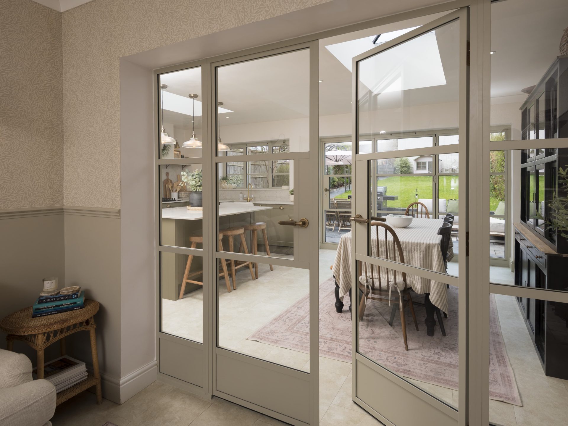 Made from tough, powder-coated aluminium, they’re available in over 150 colours with a choice of glazing styles—from clear to reeded or frosted. Glazing bar layouts can be tailored from minimalist to traditional, and finishing touches, such as knurled brass or satin nickel handles, complete the look. These internal doors don’t just look good—they also offer impressive acoustic and thermal performance, helping you create a quiet, cosy space with long-lasting quality.